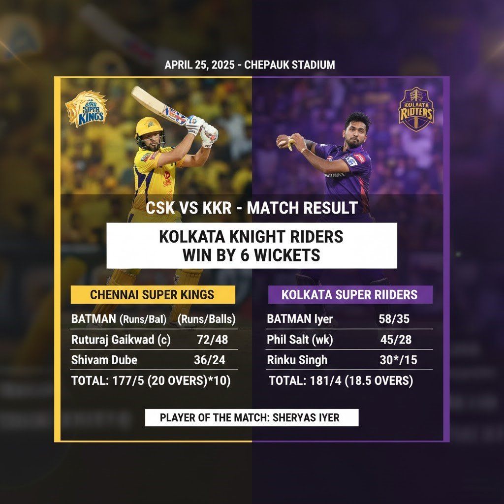 - Final Score: CSK 183/8 (19.4) def. KKR 179/6 (20.0)
