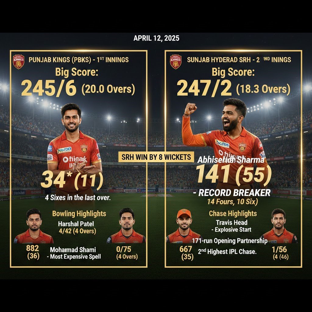 On April 12, 2025, the Rajiv Gandhi International Stadium witnessed a game that rewrote the record books. The Punjab Kings vs Sunrisers Hyderabad match scorecard for this specific day is a testament to the “batting revolution.”